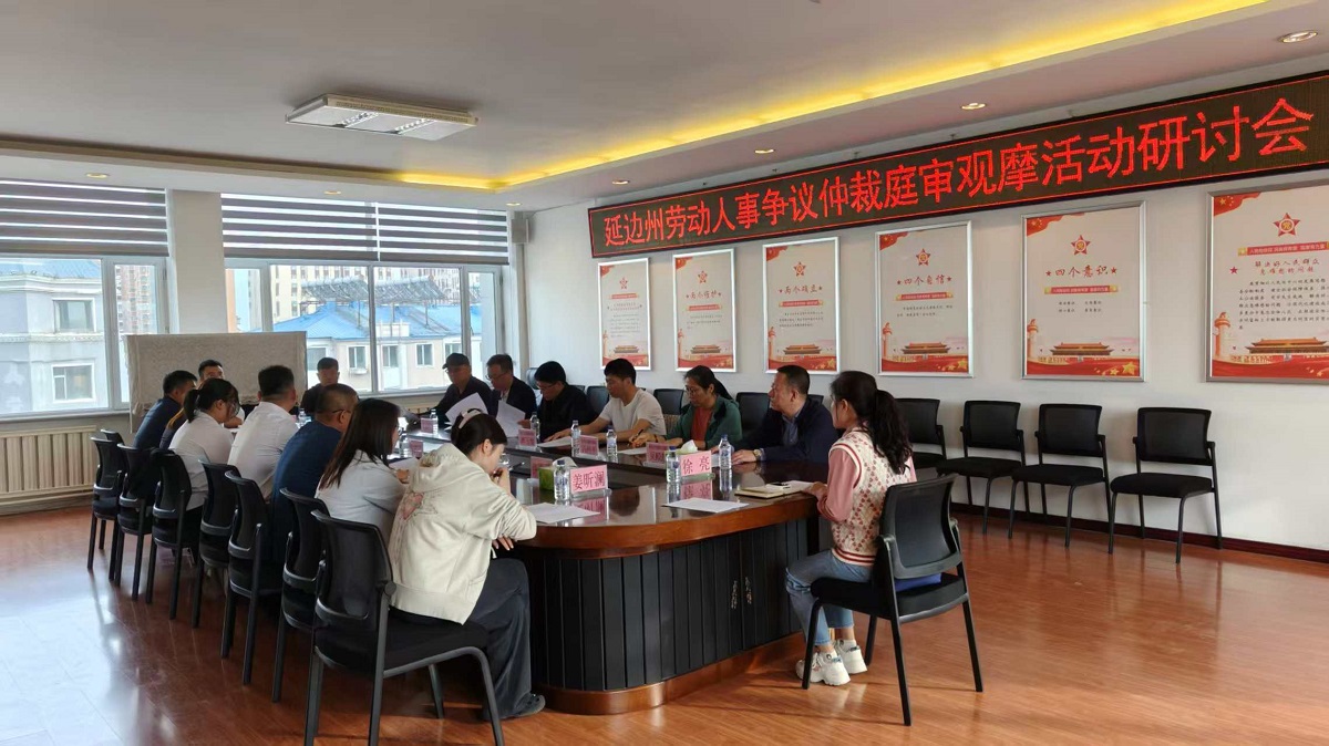为进一步推进“同城同裁”,提高劳动仲裁办案质效,9月23日,延边州人力资源和社会保障局在敦化市劳动人事争议仲裁院举办了劳动争议仲裁庭审观摩,州人社局副局长许敏、州人社局劳动关系和监察仲裁处负责人、全州各仲裁院负责人和部分骨干仲裁员参加观摩。