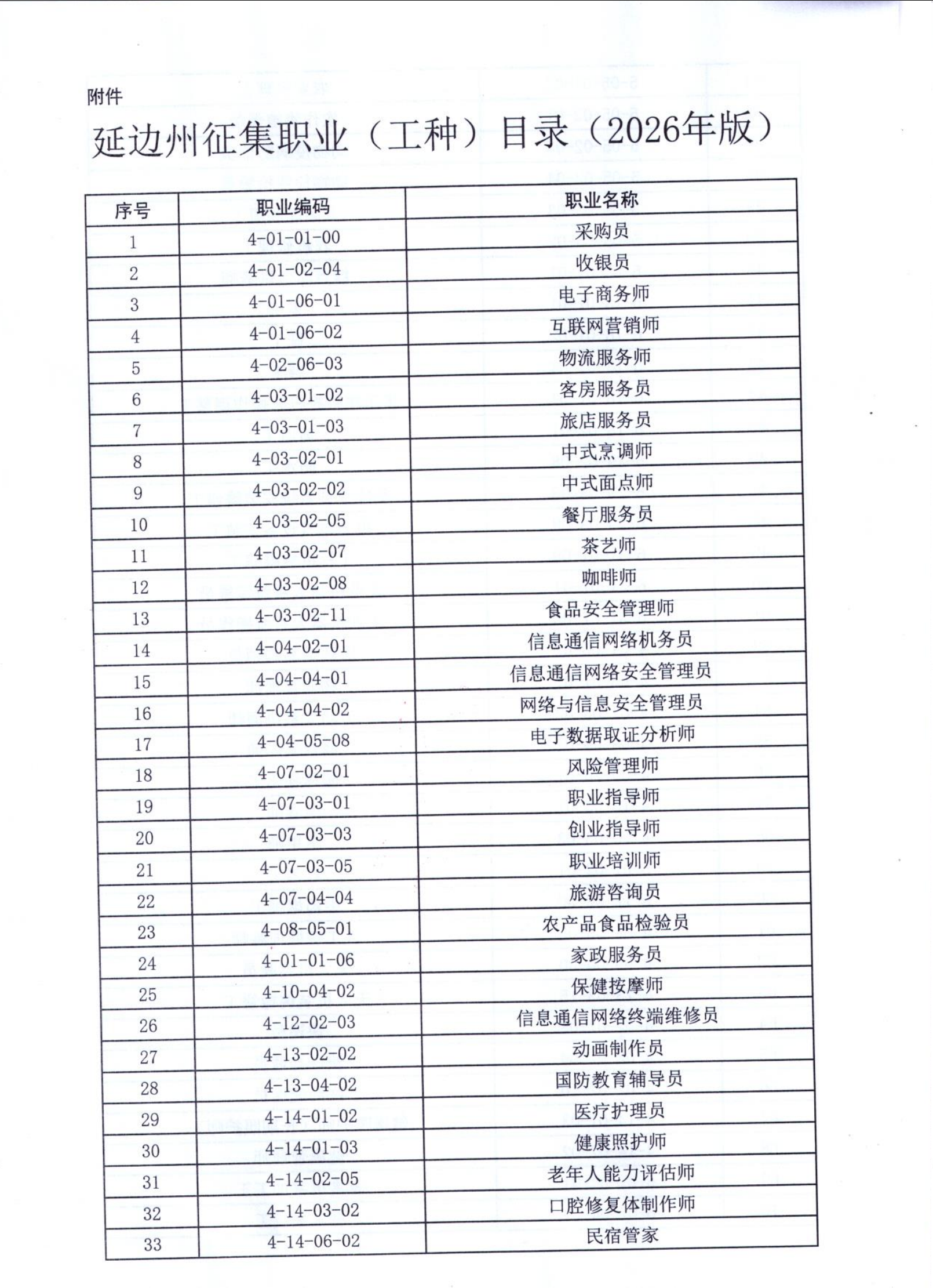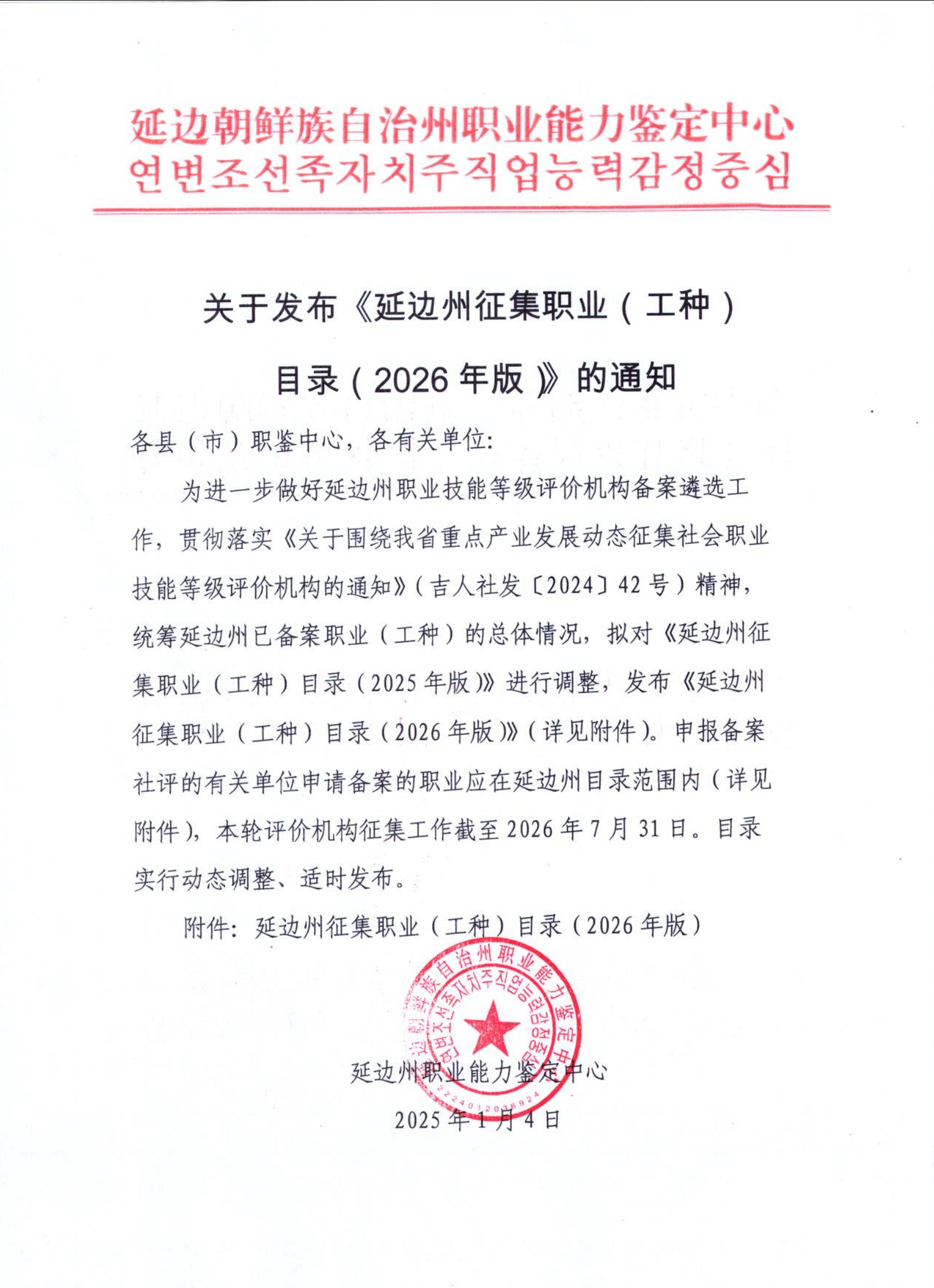 关于发布《延边州征集职业(工种)目录(2026年版)》的通知