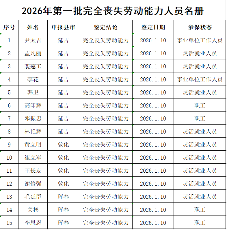 现对2026年延边州第一批完全丧失劳动能力人员进行公示,公示期:2026年1月12日至16日。监督举报电话:0433-2879016。