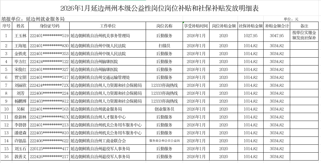 2026年1月延边州就业服务局共为州本级10家用人单位16人发放公益性岗位岗位补贴和公益性岗位社保补贴总计4.85万元,其中公益性岗位岗位补贴3.23万元,公益性岗位社保补贴1.62万元(公示内容见下方图片)。公示期为2026年1月16日至2026年1月20日。