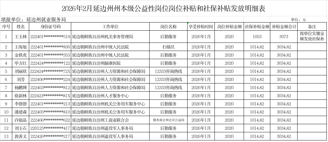 2026年2月延边州就业服务局共为州本级8家用人单位13人发放公益性岗位岗位补贴和公益性岗位社保补贴总计3.95万元,其中公益性岗位岗位补贴2.63万元,公益性岗位社保补贴1.32万元。公示期为2026年2月4日至2026年2月10日。