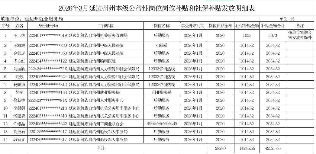 2026年3月延边州就业服务局共为州本级9家用人单位14人发放公益性岗位岗位补贴和公益性岗位社保补贴总计4.25万元,其中公益性岗位岗位补贴2.83万元,公益性岗位社保补贴1.42万元。公示期为2026年3月25日至2026年3月31日。
