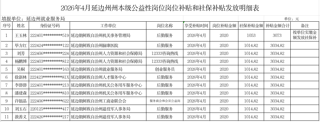 2026年4月延边州就业服务局共为州本级8家用人单位11人发放公益性岗位岗位补贴和公益性岗位社保补贴总计3.34万元,其中公益性岗位岗位补贴2.22万元,公益性岗位社保补贴1.12万元。公示期为2026年4月15日至2026年4月21日。