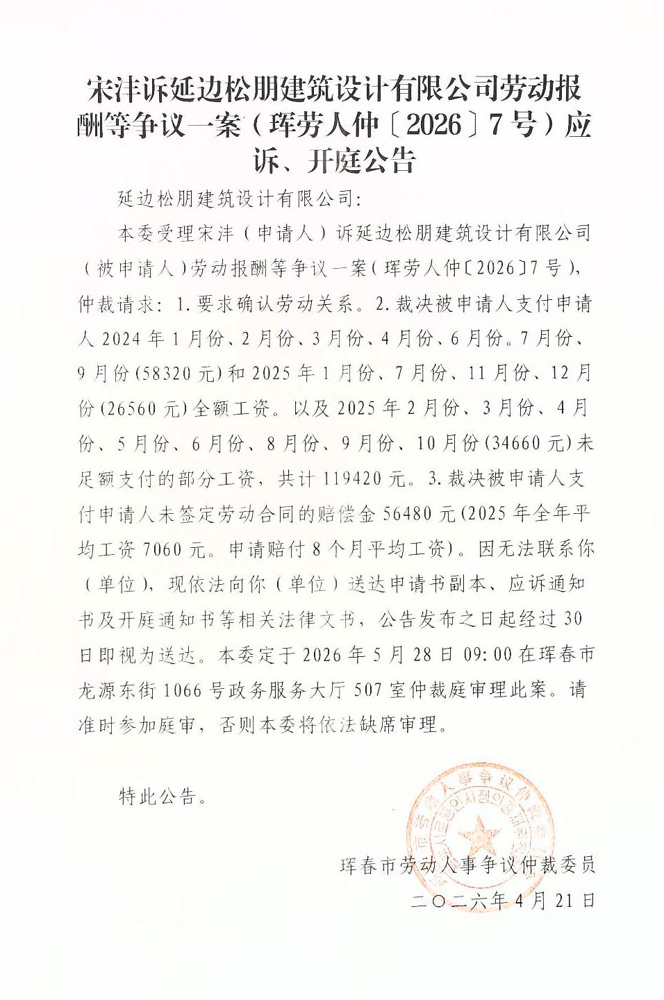 宋沣诉延边松朋建筑设计有限公司劳动报酬等争议一案(珲劳人仲(2026】7号)应诉、开庭公告