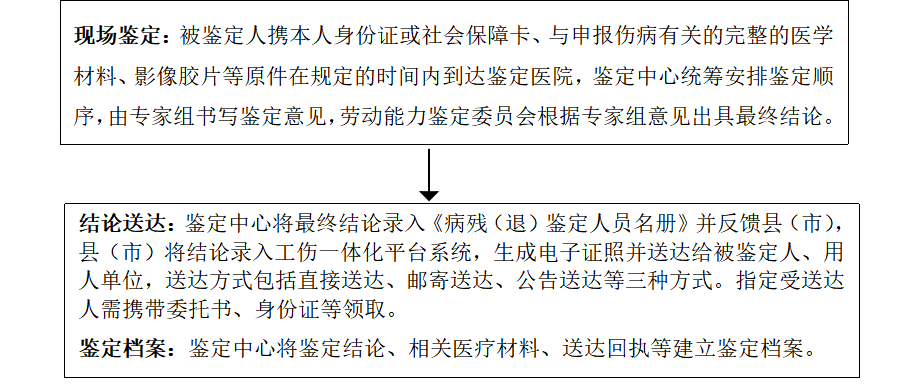 被鉴定人可委托用人单位或其近亲属代办病残(退)鉴定申请事宜,代办人即申请人,填写《劳动能力鉴定申请表(因病或非因工致残人员丧失劳动能力鉴定)》(以下简称《申请表》)。鉴定结束后,鉴定结论一般以纸质版《因病或非因工致残丧失劳动能力初次/重新鉴定结论书》(以下简称《鉴定结论书》)的形式送达给被鉴定人、用人单位。领取鉴定结论时,被鉴定人或用人单位的指定受送达人应携带本人身份证原件、《个人授权领取委托书与结论送达回执》或《单位授权领取委托书与结论送达回执》(以下合并简称《委托书与送达回执》)。